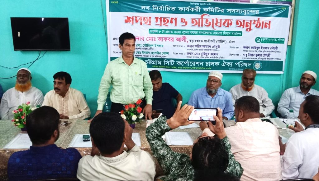 চট্টগ্রাম সিটি কর্পোরেশন চালক ঐক্য পরিষদের নবনির্বাচিত সদস্যদের শপথ গ্রহন অনুষ্ঠান শনিবার ৬ জুলাই চট্টগ্রাম ওয়াসা সংলগ্ন সংগঠনের কার্যালয়ে অনুষ্টিত হয়েছে ।